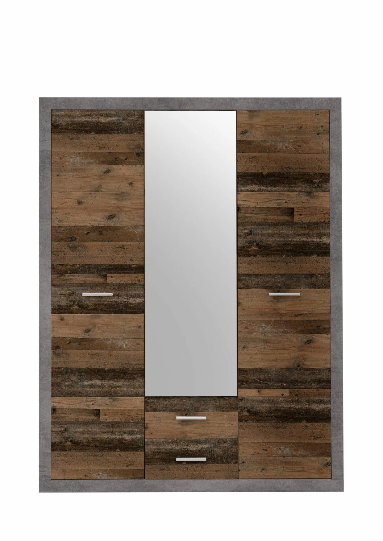 L’armoire est fabriquée en aggloméré, avec un cadre en décor d’oxyde de béton et des portes d’armoire vieux style, munies de poignées en plastique qui s’harmonisent parfaitement. L’armoire semble symétrique de l’extérieur, mais sa disposition intérieure est légèrement différente. Sur le côté gauche, il y a trois étagères de même taille, tandis qu’au milieu, il y a de la place au-dessus des deux tiroirs pour ranger quelques chaussures par exemple. Il y a également une grande tringle à vêtements derrière les portes du milieu et de droite, avec une étagère tout aussi large au-dessus. Une armoire idéale pour le sceptique qui réside en chacun de nous !