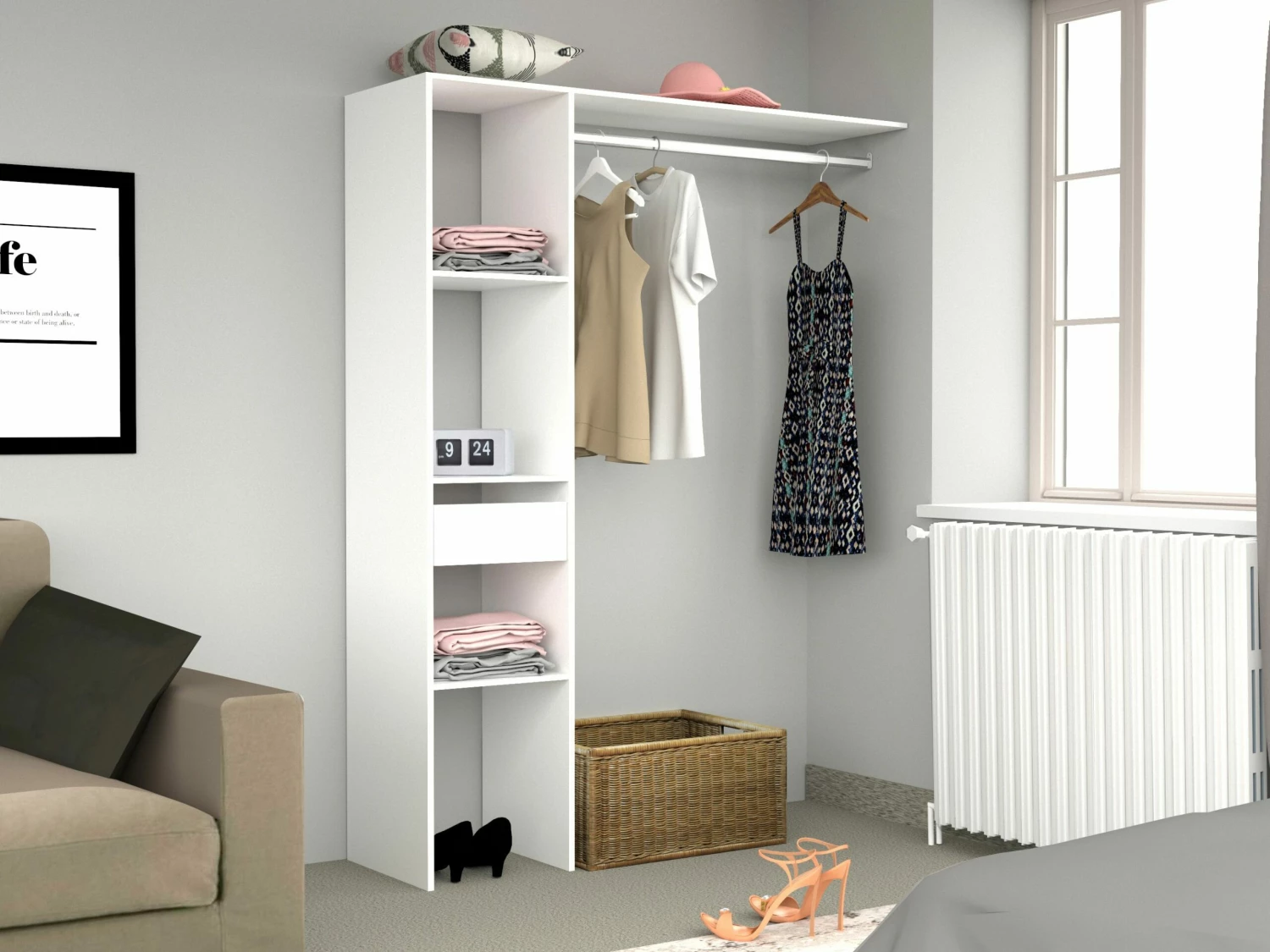 Cette armoire est fabriquée en panneaux de particules avec une finition en mélamine blanche. Cette armoire est équipé de trois étagères, d’un tiroir et d’une tringle à vêtements. Il est nécessaire de fixer l’armoire au mur de manière à ce qu’elle soit solide.