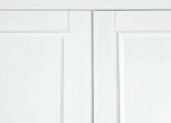 Cette garde-robe à 2 portes comprend 3 tablettes à gauche. La porte à droite cache une tringle et une autre tablette. Les portes se ferment à l’aide d’aimants. Vous disposez en bas de 2 tiroirs qui s’ouvrent et se referment facilement grâce aux coulisses métalliques.