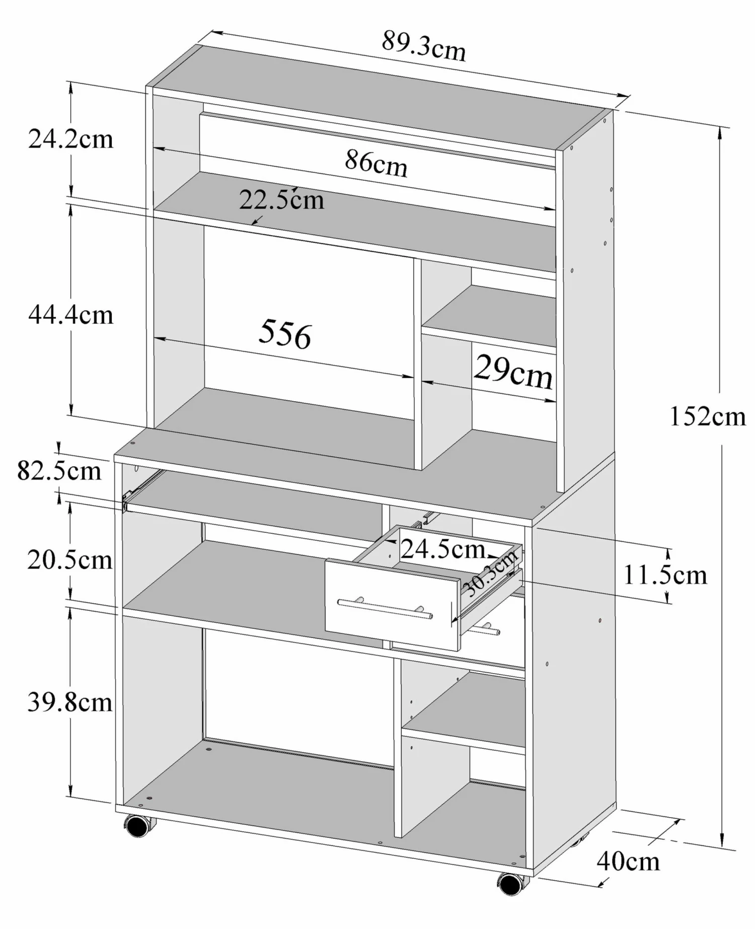 Une armoire de cuisine qui peut accueillir votre four à micro-ondes, cafetière et vos ustensiles de cuisine ? Ne cherchez plus, c’est l’armoire Cesar qu’il vous faut ! Cette armoire comprend entre autres 6 niches de différentes tailles, 2 tiroirs, un rangement avec 2 portes et un rangement avec porte et tablette.