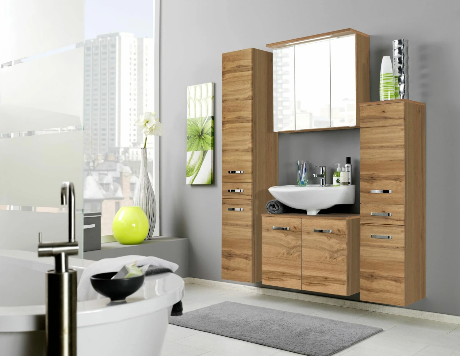 Apportez une touche chaleureuse à votre salle de bains avec les meubles de la collection Bobbi, qui comprend également cette armoire de toilette de 80 cm de large. L’armoire est équipée de 3 portes, de 6 étagères en verre, d’éclairage LED (1,6 W), d’un interrupteur et d’une prise de courant. Elle est réalisée en panneaux de particules mélaminés avec un décor en chêne.