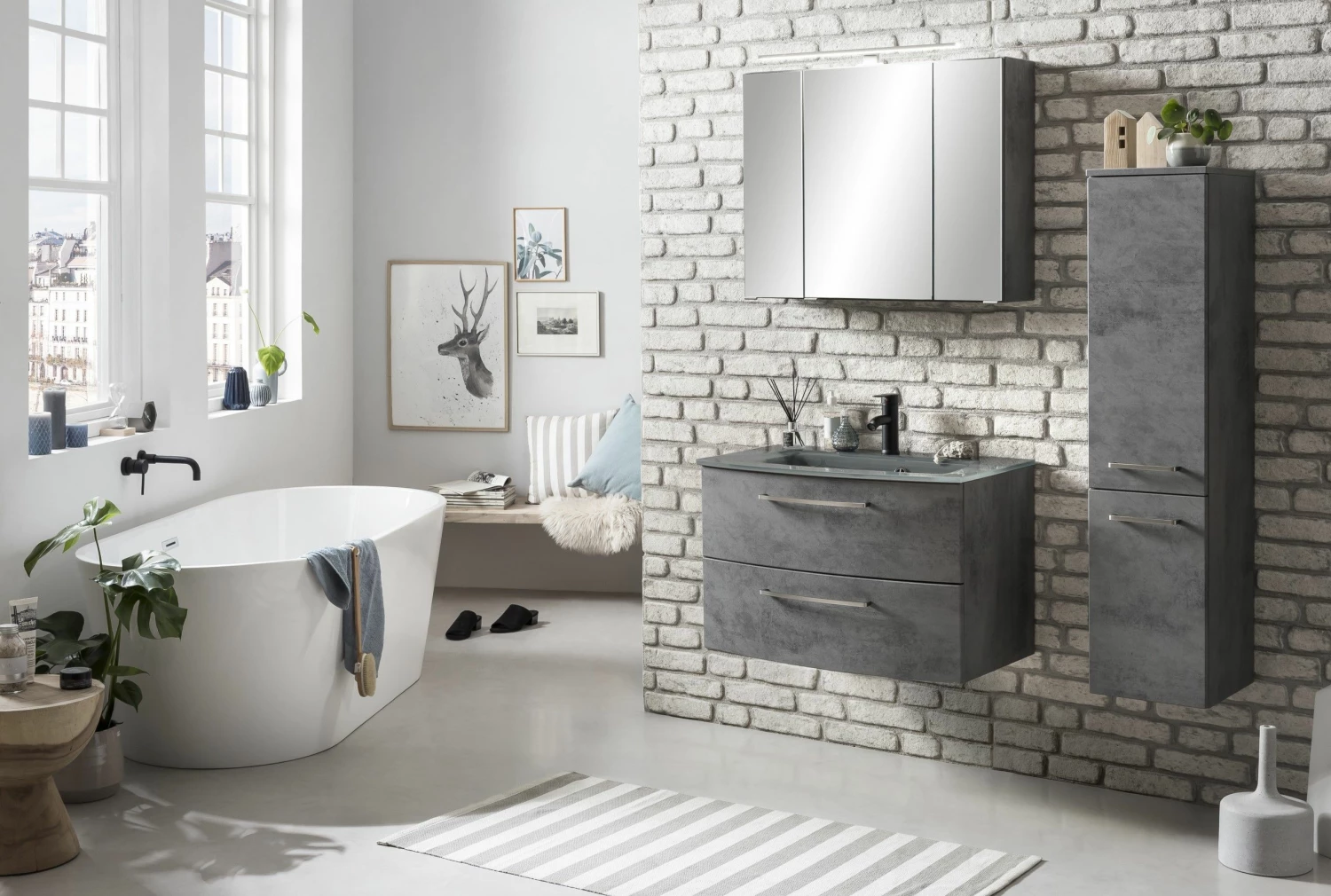 Relookez votre salle de bains avec les meubles de la collection Stivan, qui sont dotés d’un décor en béton. Cette armoire de toilette a 80 cm de large et est équipée de 3 portes miroir, de 6 étagères en verre, d’éclairage à LED (7 Watt), d’un interrupteur et d’une prise de courant.