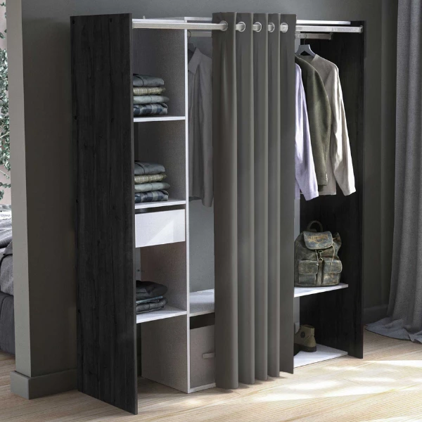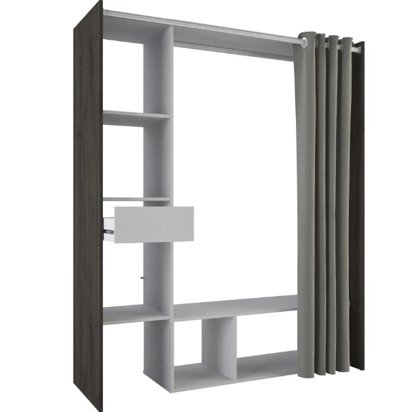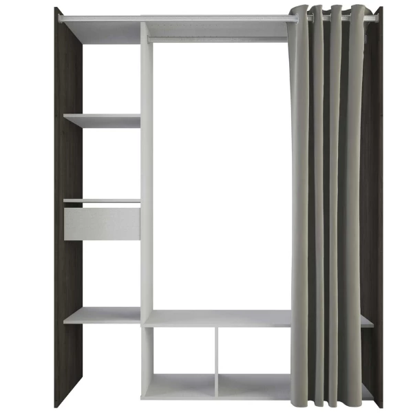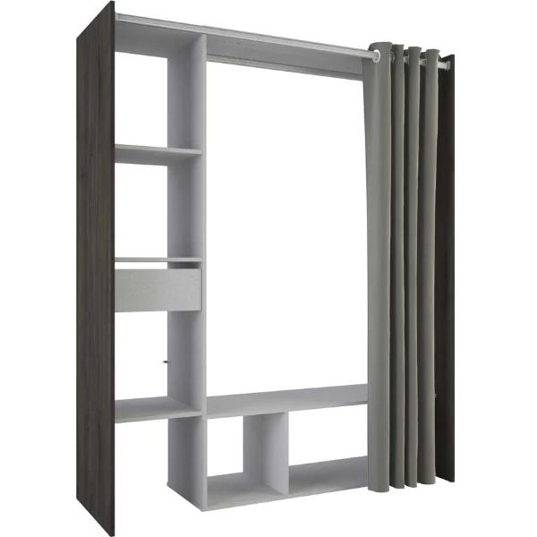 Optez pour un peu plus de classe dans la chambre à coucher avec armoire Monette en décor chêne Waterford chic. Cette armoire consiste de 6 compartiments de rangement, d’un tiroir et d’une tringle pour stocker votre garde-robe personnelle. En fermant le rideau vos vêtements resteront libres de poussière et l’armoire aura une apparance plus nette. L’armoire peut d’ailleurs être sciée sur mesure et ainsi être adaptée à chaque espace comme le hall d’entrée et le dressing. La longueur peut être raccourci jusqu’à 115 cm au minimum. Créez le dressing de vos rêves avec armoire Monette! Les vis et les chevilles pour le montage mural ne sont pas inclus.