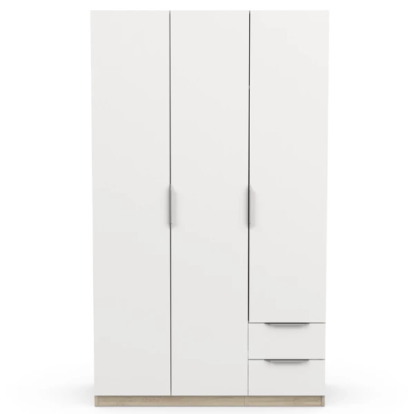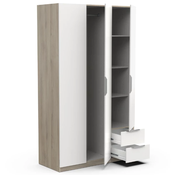 Armoire Seliena 3 Portes Tournantes, 1 Tringle, 4 étagères Et 2 Tiroirs-Chêne Brossé/blanc Mat