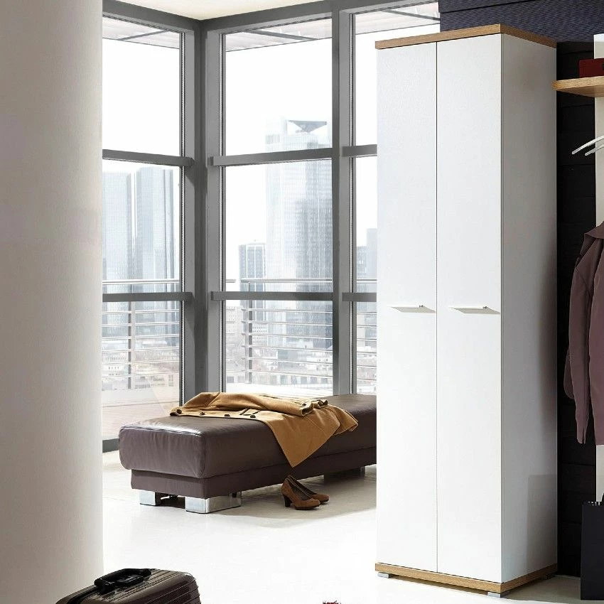 La collection Tosun en blanc avec des accents en chêne décoratif crée un look moderne mais naturellement chaleureux dans votre hall d’entrée. Cette solution attrayante mais peu encombrante conviendra à presque tous les intérieurs. L’armoire de deux mètres de haut est équipée d’une tringle à vêtements rétractable et de deux étagères, idéales pour ranger vos manteaux et vos accessoires. Les portes sont faciles à ouvrir à l’aide de poignées métalliques.
