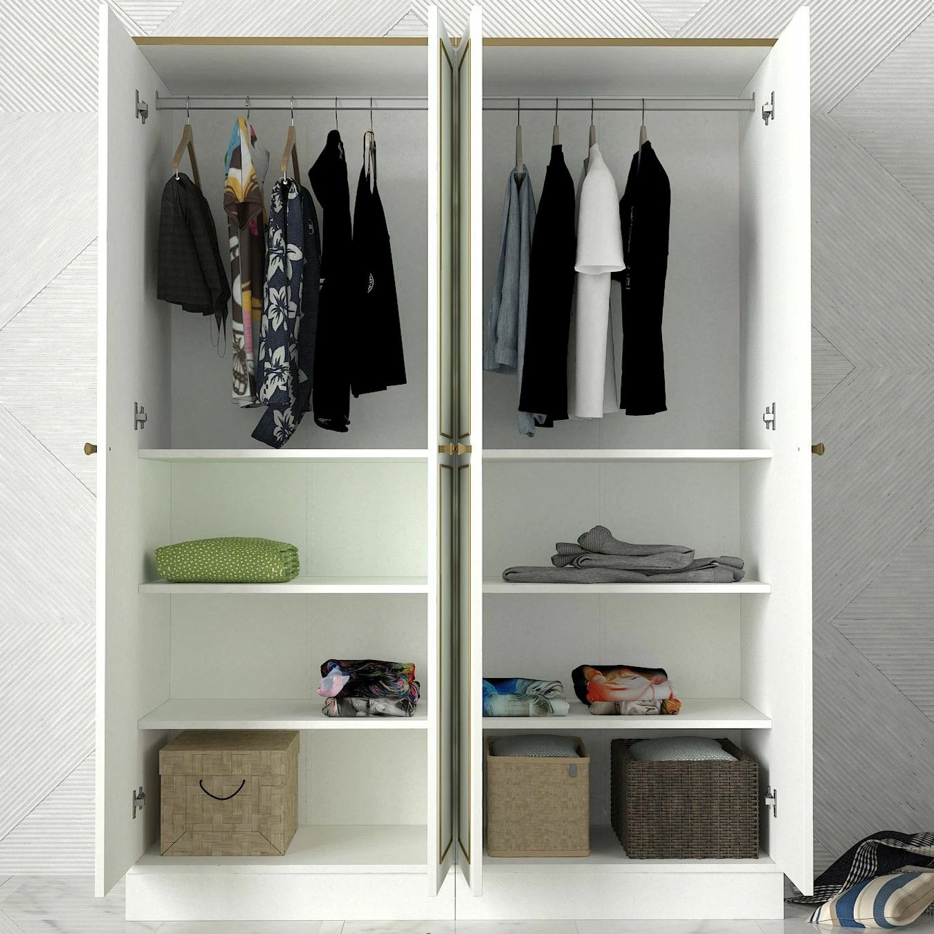 Avec des dimensions totales de 140 cm de largeur, 194 cm de hauteur et 47 cm de profondeur, cette armoire offre un vaste espace de rangement pour tous vos vêtements, accessoires et effets personnels. L’intérieur spacieux est conçu pour accueillir un large éventail d’articles, notamment des vêtements longs, des vêtements pliés, des chaussures et même des boîtes de rangement.